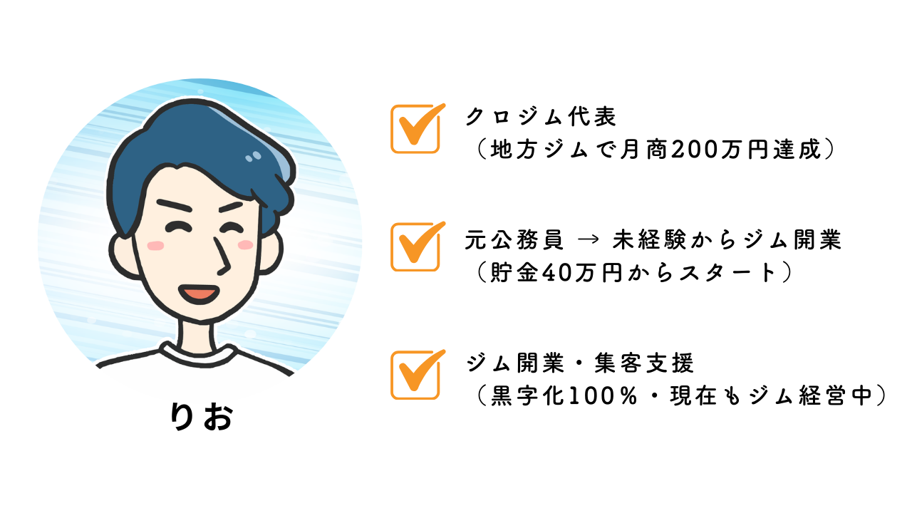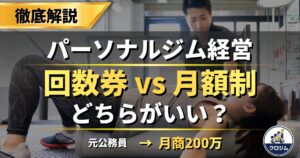 この記事を書いている私は、元公務員(トレーナー未経験)からパーソナルジムを開業し、地方ジムで月商200万円を達成しました。現在もジム経営を行いながら、その実体験と開業支援の実例をもとに、パーソナルジム開業・独立・集客・経営ノウハウを発信しています。私のプロフィールはこちら。